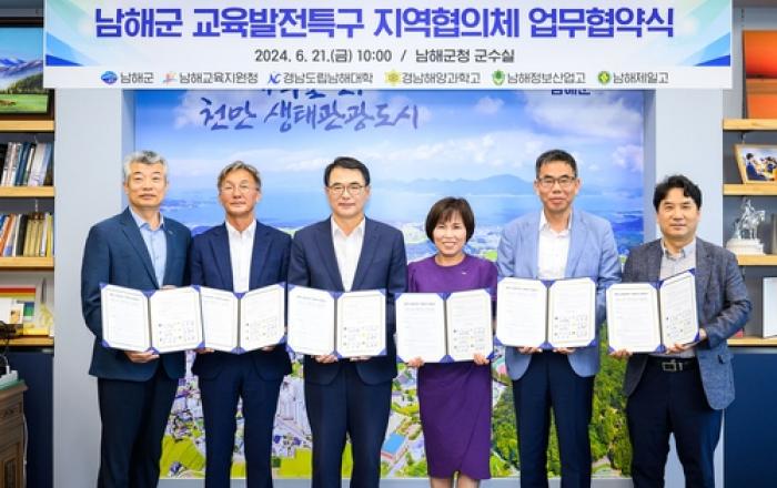남해군은 지난 21일 '교육발전특구 시범지역' 지정을 위해 관내 5개 기관과 업무협약을 체결했다. 이날 협약식에는 장충남 남해군수, 오은숙 남해교육장, 노영식 경남도립남해대학총장, 안병규 경남해양과학고등학교장, 하성일 남해정보산업고등학교장, 김익수 남해제일고등학교장