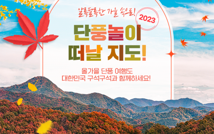 알록달록한 가을 속으로! 2023 단풍놀이 떠날 지도! 올가을 단풍 여행도 대한민국 구석구석과 함께하세요! 단풍에 대해 알아보기 올해 첫 단풍은 평년보다 느려요. 단풍 시작 시기는 일반적으로 기온이 낮을수록 빨라져요. 첫 단풍은 정상에서부터 20%가량 단풍이 들