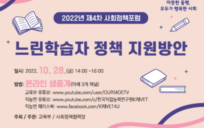 교육부는 한국직업능력연구원 등 사회 분야 연구기관과 함께 ‘느린학습자 정책 지원방안’을 주제로 제4차 공개토론회(포럼)를 개최한다고 28일 밝혔다. 한국 인구의 약 14%가 느린학습자로 추정된다. 하지만 장애와 비장애의 경계에 위치해 특수교육과 일반교육 어디에도