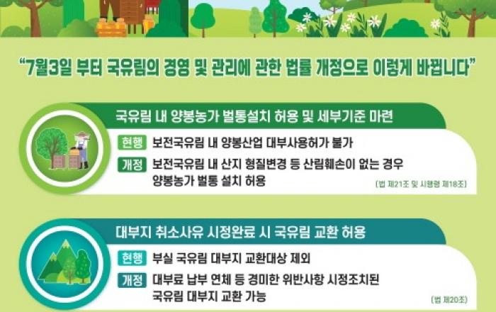 산림청은 ‘국유림의 경영 및 관리에 관한 법률’ 일부개정안이 다음달 3일부터 시행된다고 26일 밝혔다. 개정안의 주요내용으로는 △보전국유림 내 벌통 설치허용 △대부지 취소사유 조치 완료 시 국유림 교환 허용 △대부료(사용료)에 대한