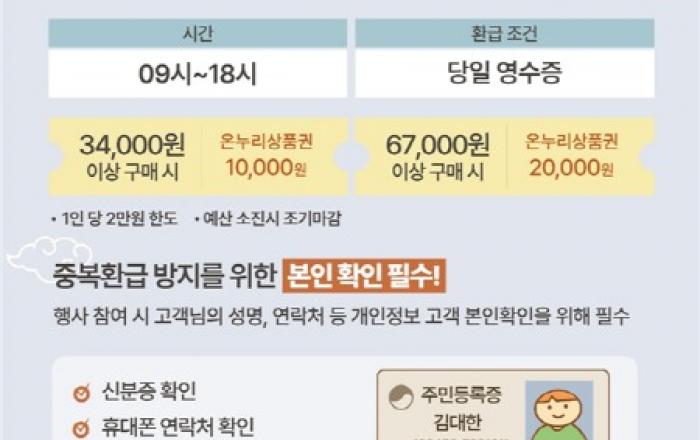 설을 맞아 전통시장에서 국산 농축수산물을 구매하면 구매 금액의 최대 30%를 1인당 최대 2만 원까지 온누리상품권으로 돌려준다. 해양수산부와 농림축산식품부는 1일 농축수산물 소비자 물가부담 완화를 위해 오는 2일부터 8일까지 설맞이 전통시장 온누리상품권 환급행사를