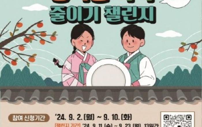 환경부 산하 한국환경공단은 추석 연휴를 앞두고 낭비 없는 음식문화 조성을 위한 음식물 쓱싹 줄이기 도전(챌린지) 행사를 실시한다고 밝혔다.이번 행사의 참여 대상은 알에프아이디(RFID) 종량기 후불제*를 사용하는 세대(약 624만 세대) 이며 행사 기간인 9월 11일부