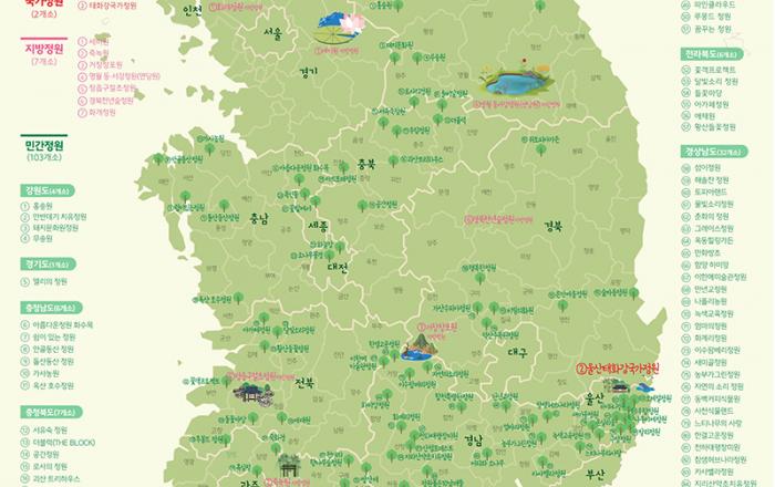 산림청은 전국에 등록된 국가·지방·민간 112개 정원 정보를 한눈에 볼 수 있는 ‘대한민국 정원여행’ 지도를 제작해 배포한다고 밝혔다. ‘대한민국 정원여행’ 지도에는 국가정원 2곳, 지방정원 7곳, 민간정원 103곳 등 총 112곳의 정원을 소개하고 있다. 지도는