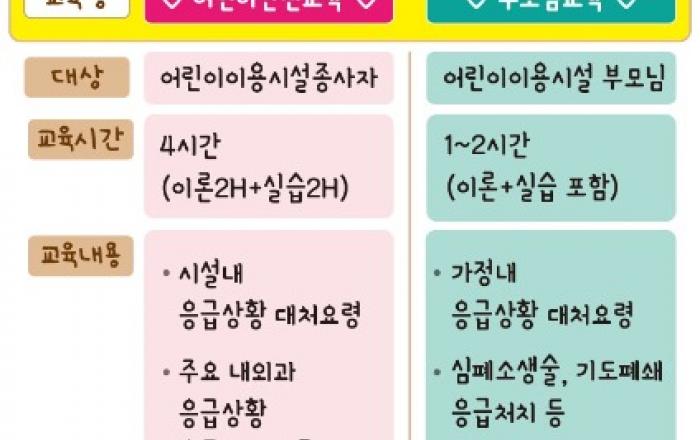 어린이안전법에 의거 행정안전부 지정 어린이안전교육전문교육기관인 (사)재난구호사협회(제2021-27호)에서는 찾아가는 어린이안전교육을 4년차 실시하고 있다.어린이이용시설 종사자는 어린이안전교육을 매년 4시간(실습 2시간 이상) 이수하여야 한다.응급상황대처요령습득, 주요