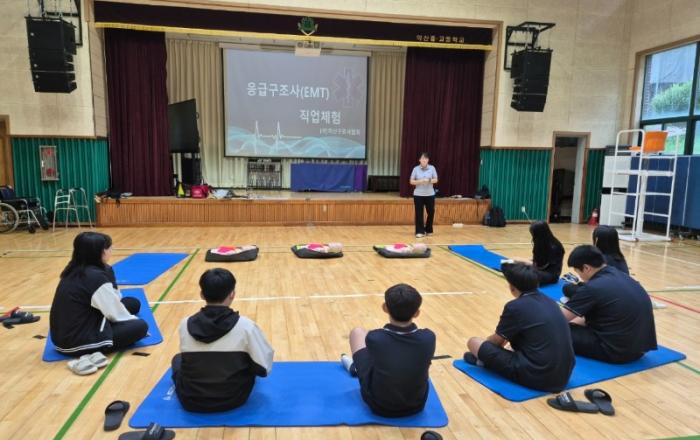 (사)재난구호사협회. 약산중학교 (10명)을 대상으로 꿈길 교육부 연계 프로그램인 진로체험버스 "찾아가는 응급구조사(EMT) 및 사회복지사 직업체험"을 학교 강당에서 실시하였습니다.꿈과 희망으로 미래의 선도적인 역할을 하는 청소년들에게 "응급구조사(EMT)""사회복지사