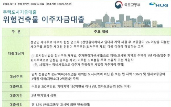 LH는 주거환경개선사업구역과 재개발사업구역 내 노후·불량주택 등 위험건축물 거주자에게 연 1.3%의 금리로 전세자금을 지원한다고 밝혔다.이 사업은 도심 내 노후 건축물을 신속하게 정비하고 노후·위험건축물로부터 주민을 보호하기 위해 지난 ’18년부터 실시됐다.LH는 사업