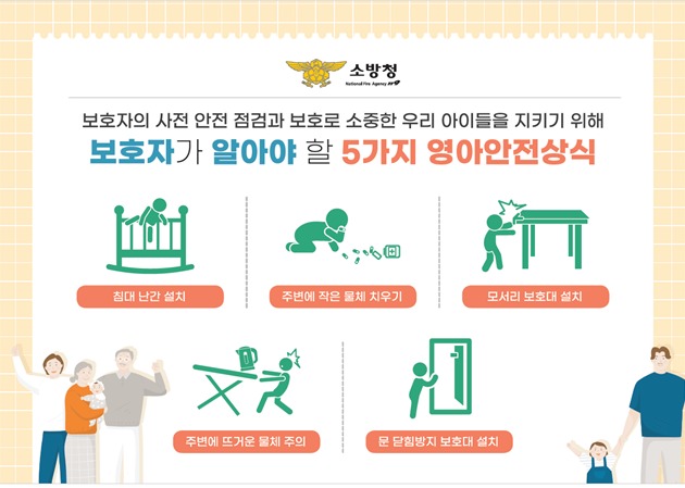 이상무 소방청 생활안전과장은 “영아 안전사고는 부모들의 관심과 작은 실천으로도 충분히 예방이 가능하다”며 “예비 부모 및 영유아 보호자를 위한 가정 내 안전점검표를 6월부터 소방청 누리집에 게시하고, 생활 속 영유아 안전사고 예방 캠페인을 지속 추진할 예정이니 관심을 기울여 주시기 바란다”고 전했다.