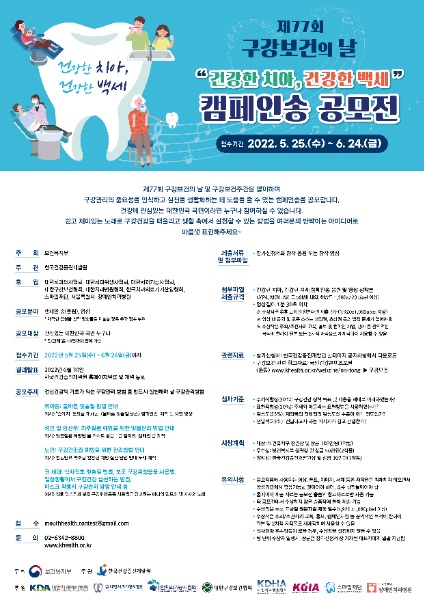 보건복지부(장관 권덕철)와 한국건강증진개발원(원장 조현장)은 6월 9일(목) 제77회 구강보건의 날*을 기념해「“건강한 치아, 건강한 백세” 캠페인송 공모전」을 개최한다.
