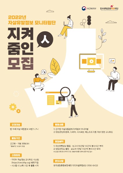 보건복지부(장관 권덕철)와 한국생명존중희망재단(이사장 황태연)은 2022년 미디어 자살 정보 모니터링단 ‘지켜줌인’ 모집을 시작한다고 밝혔다.