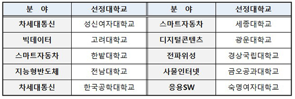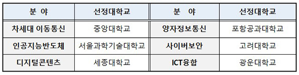올해는 국가 필수전략기술 및 산업적 수요가 높은 분야인 ▲차세대이동통신 ▲양자정보통신 ▲인공지능반도체 ▲사이버보안 ▲디지털콘텐츠 ▲ICT융합 등 6개 분야를 선정했다. 선정된 대학에는 최장 8년간 연 10억원 수준을 지원한다.