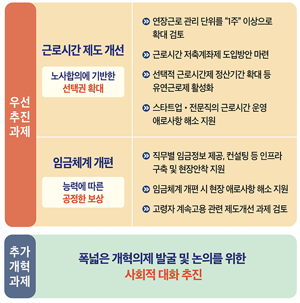 이 장관은 브리핑에서 “지속가능하고 미래지향적인 노동시장 구축을 목표로 노동시장 제도·관행·의식을 혁신해 나가겠다”면서 근로시간과 임금체계 개편 추진방향을 설명했다.