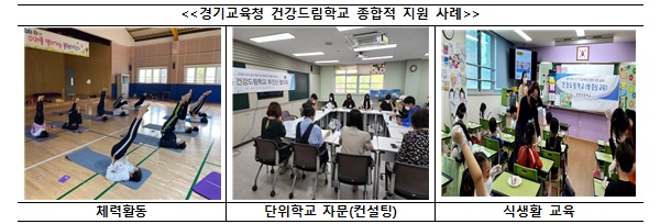 서울·경기교육청은 체력증진 프로그램을 식단, 생활 습관(비만관리) 등 영양·보건 교육과 함께 종합적으로 지원한다. 체육·영양·보건 교사가 참여해 교육청 단위의 학교 지원 자문단(컨설팅단)도 구성·운영한다.