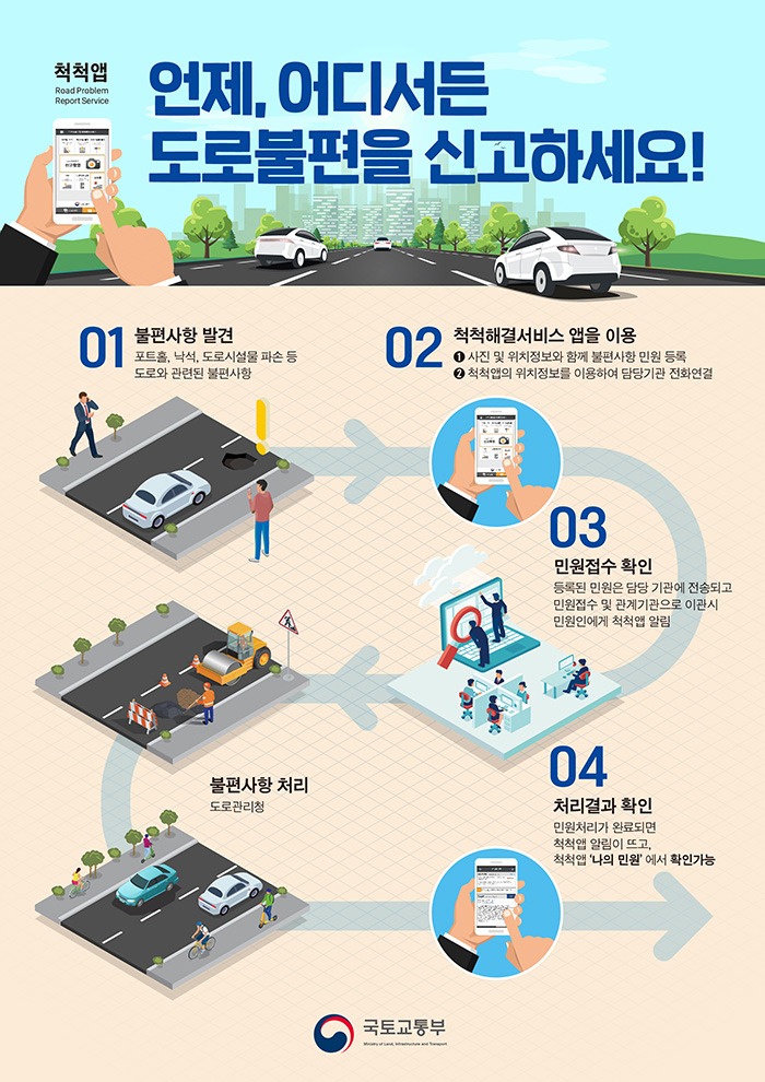 19년부터 운영 중인 도로안전 국민참여단은 3년 동안 총 56,037건의 도로불편사항을 스마트폰 앱인 ‘척척해결서비스’로 신고하였으며, 도로안전 정책에 대한 의견도 다양하고 적극적으로 제시하는 등 국민 참여형 정책의 성공적 사례로 손꼽힌다.