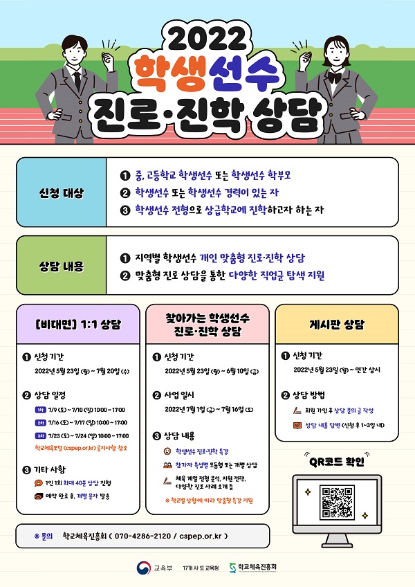 교육부는 17개 시도교육청·학교체육진흥회와 함께 학생선수의 진로를 고민하고 맞춤형 진로상담을 통한 다양한 직업군 탐색 기회 및 진로 개발을 지원하기 위해 ‘2022년 학생선수 진로·진학상담 프로그램’을 운영한다고 11일 밝혔다.