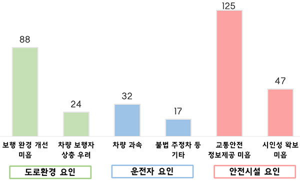 이 결과 총 333건의 위험요인이 도출됐다. 이중 교통안전 정보 제공 미흡과 같은 안전시설 요인이 172건으로 가장 많았고 도로 환경 요인이 112건, 운전자 요인이 49건이었다.