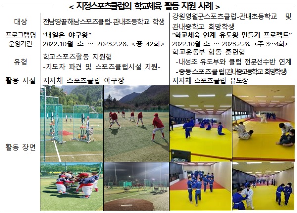 이 밖에 학교구성원의 체육 전문역량을 함양하는데 지원하는 사업도 있다. ‘학교-종목단체-지정스포츠클럽’을 연계해 학교의 체육교사와 강사에게 종목별 연수를 지원하는 형식으로 진행된다.