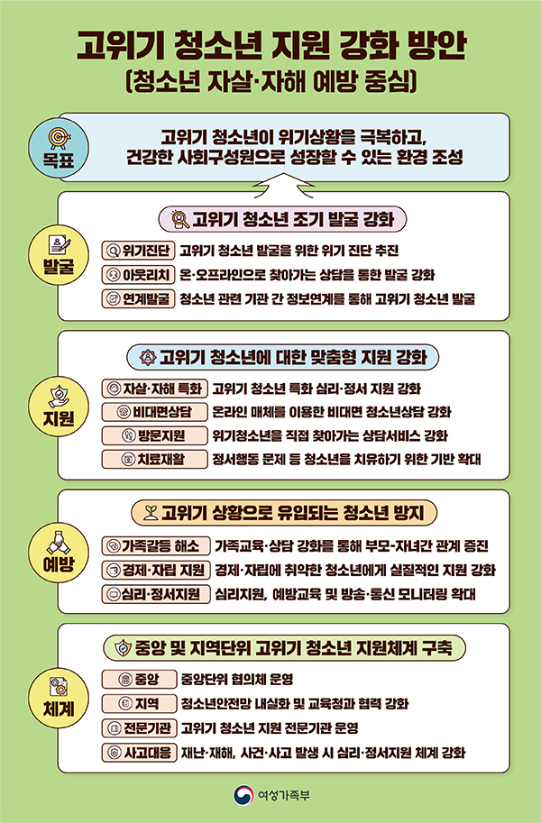 정부는 청소년들이 고위기 상황으로 유입되지 않도록 청소년상담복지센터 240곳과 가족센터 244곳의 고위기 청소년 가족상담 기능을 강화한다. 교육청과 연계해 자살·자해 고위험군 청소년의 부모교육도 확대한다.