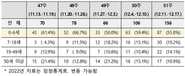 특히 신고된 환자 중 0~6세는 지난 11월부터 50% 이상을 기록하며 주로 영유아를 중심으로 발생이 증가하고 있는 것으로 확인됐다.