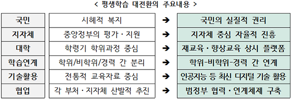 이번 방안은 ‘평생교육법’ 제9조 제1항에 따른 제5차 평생교육진흥기본계획으로 누구나 누리는 맞춤형 평생학습 진흥을 위해 디지털 대전환, 초고령사회 등 시대적 변화에 대비한 ‘평생학습 대전환’을 정책방향으로 삼았다.