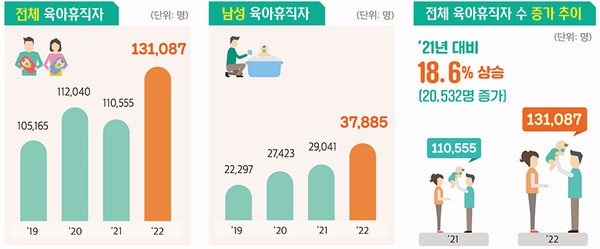 육아휴직자는 13만 1087명으로 전년 대비 18.6% 증가했고, 육아기 근로시간 단축 사용자도 1만 9466명으로 전년 대비 16.6% 늘어났다.