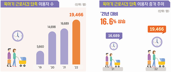 2022년 육아기 근로시간 단축 사용자 수는 1만 9466명으로 전년보다 16.6%(2777명) 증가했다.