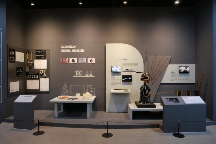 ▲ 5부 ‘다시 살아나는 고대 기술’에서는 출토유물을 연구하여 밝힌 유물의 제작기법과 이를 통해 만든 재현품이 전시된다. 이와 함께 재현품의 제작과정을 기록한 영상과 실제 복원 과정에 사용된 도구, 3차원 인쇄(3D 프린팅) 시제품을 함께 전시하여 관람객이 유물의 복원 과정을 쉽게 이해할 수 있도록 하였다.
