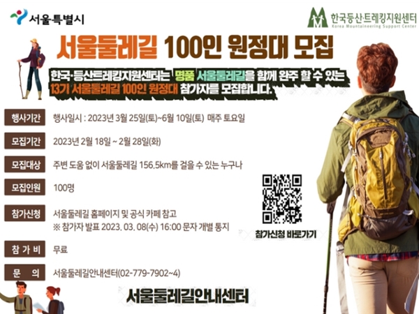 서울특별시는 서울둘레길의 대표 트레킹 프로그램, “서울둘레길 100인 원정대” 참여자를 2023년 2월 18일부터 2월 28일까지 온라인으로 모집한다.