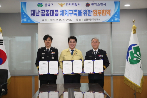 서울 관악구가 화재 등 재난 발생 시 신속한 재난대응 협력 체계 구축을 위해 지난 16일 관악경찰서, 관악소방서와 업무협약을 체결했다.