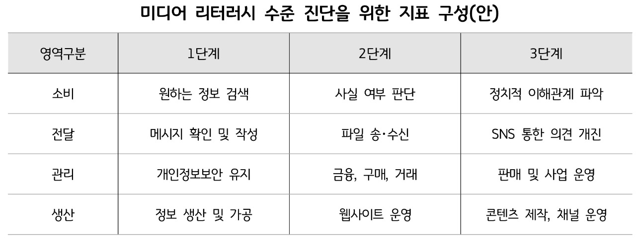 이에 연구원은 생애 주기별 미디어 리터러시 개선 전략으로 ▲정규교육 과정을 넘어 전 생애 및 계층을 대상으로 하는 새로운 문화운동 전개 ▲기술 문명을 다루는 능력에 대한 과신(過信) 진단 ▲독서와 토론을 통해 이야기를 재구성하는 상상력과 창의력 개발 ▲대면 소통 경험을 늘려 감각 능력 개발 및 유지 등을 제시했다.