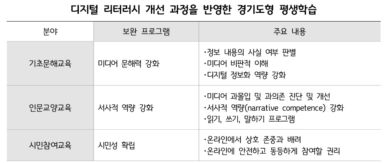 오재호 경기연구원 연구위원은 “미디어 리터러시는 정보를 비판적으로 다루는 능력과 기기를 원활하게 다루는 능력을 모두 가리키지만, 학습 과정에서 두 가지를 혼용하지 말아야 한다”면서 “디지털 시대에 미디어 리터러시를 개선하기 위해서는 역설적으로 종이책 독서, 토론, 건전한 대면과 접촉 등 아날로그 형식을 적절히 복원해야 한다”고 강조했다.