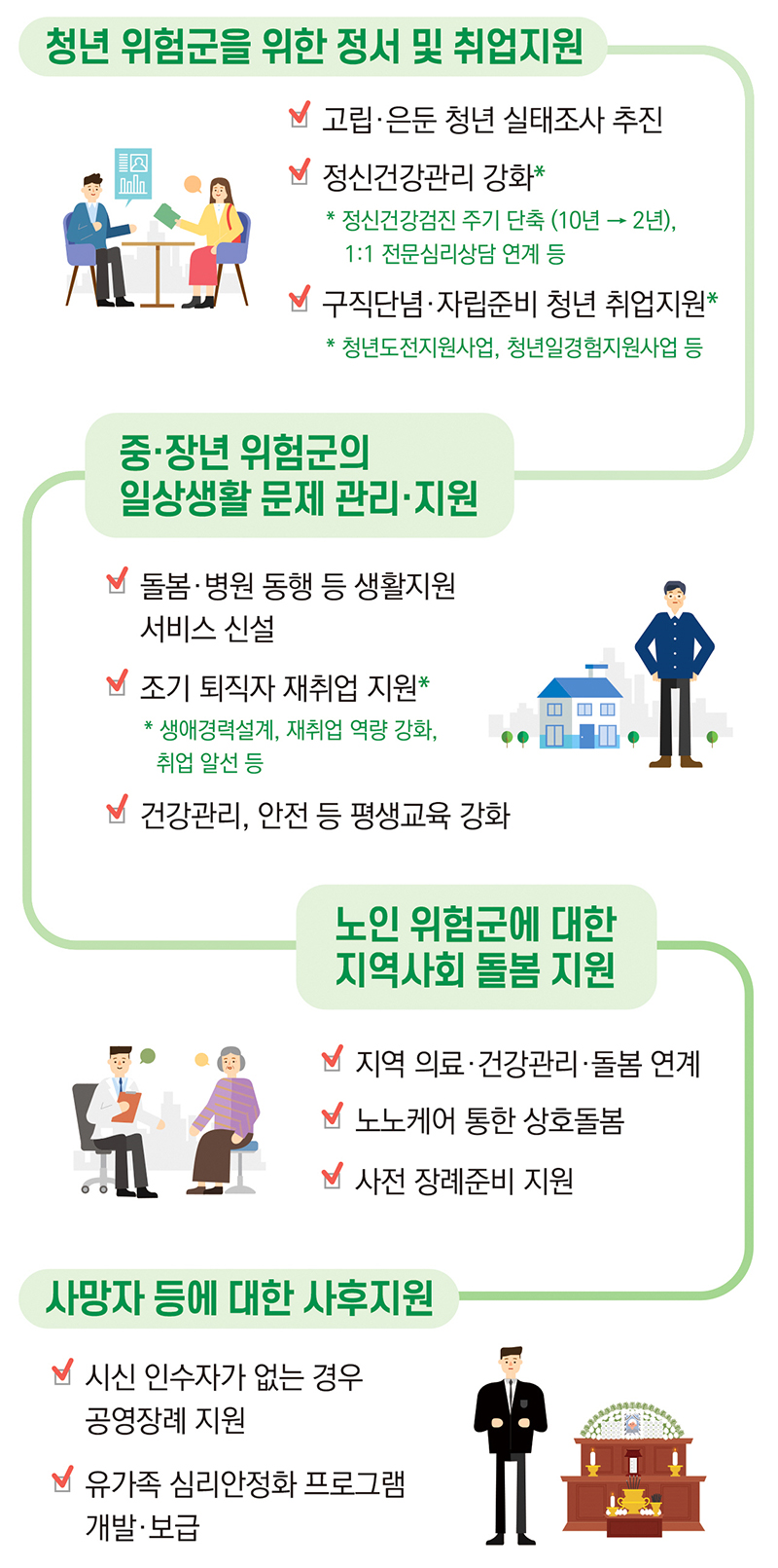 아울러 지방자치단체 통합사례관리사를 확충하고 고독사 정보시스템을 구축하는 한편, 중앙 및 지역 단위로 사회적 고립 예방·지원센터를 지정해 고독사 예방·관리를 위한 민·관 협력체계를 구축한다.