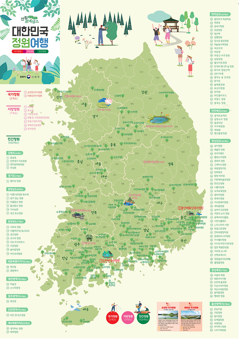 ‘대한민국 정원여행’ 지도에는 국가정원 2곳, 지방정원 7곳, 민간정원 103곳 등 총 112곳의 정원을 소개하고 있다.