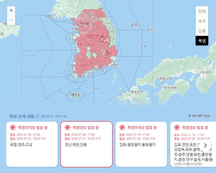 최근 전국에 쏟아진 폭우로 수많은 인명피해가 속출한 가운데 19일 전국에 걸쳐 폭염주의보 또는 폭염경보가 발령됐다.