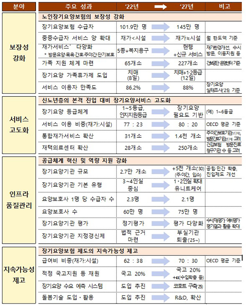 노인의 신체·인지 기능 등을 종합적으로 평가할 수 있도록 2027년까지 현행 1~5등급, 인지지원등급인 장기요양 등급체계의 개편도 추진한다.