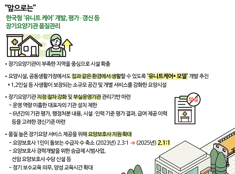 특히 요양시설과 공동생활가정에서도 집과 같은 환경에서 생활할 수 있도록 ‘유니트케어 모델’ 개발을 추진한다.