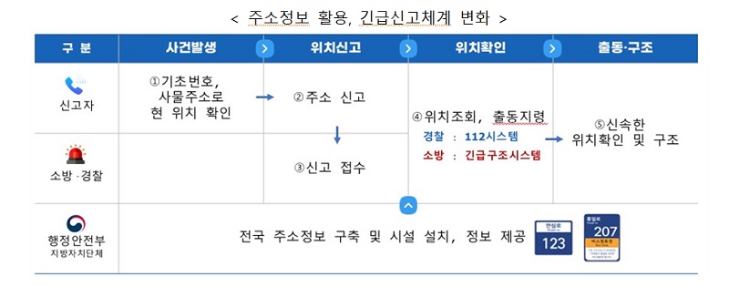 앞으로 경찰·소방 긴급구조기관의 신고출동시스템에 주소 정부가 탑재돼 신속한 위치 파악과 출동이 가능해지게 됐다.
