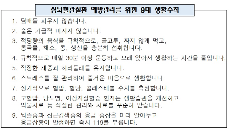 질병관리청은 오는 29일 세계 뇌졸중의 날을 맞아 뇌졸중 예방관리를 위해 9대 수칙을 준수하고, 갑작스런 뇌졸중 발생에 대비해 조기증상과 대처요령을 미리 알아둬야 한다고 27일 밝혔다.