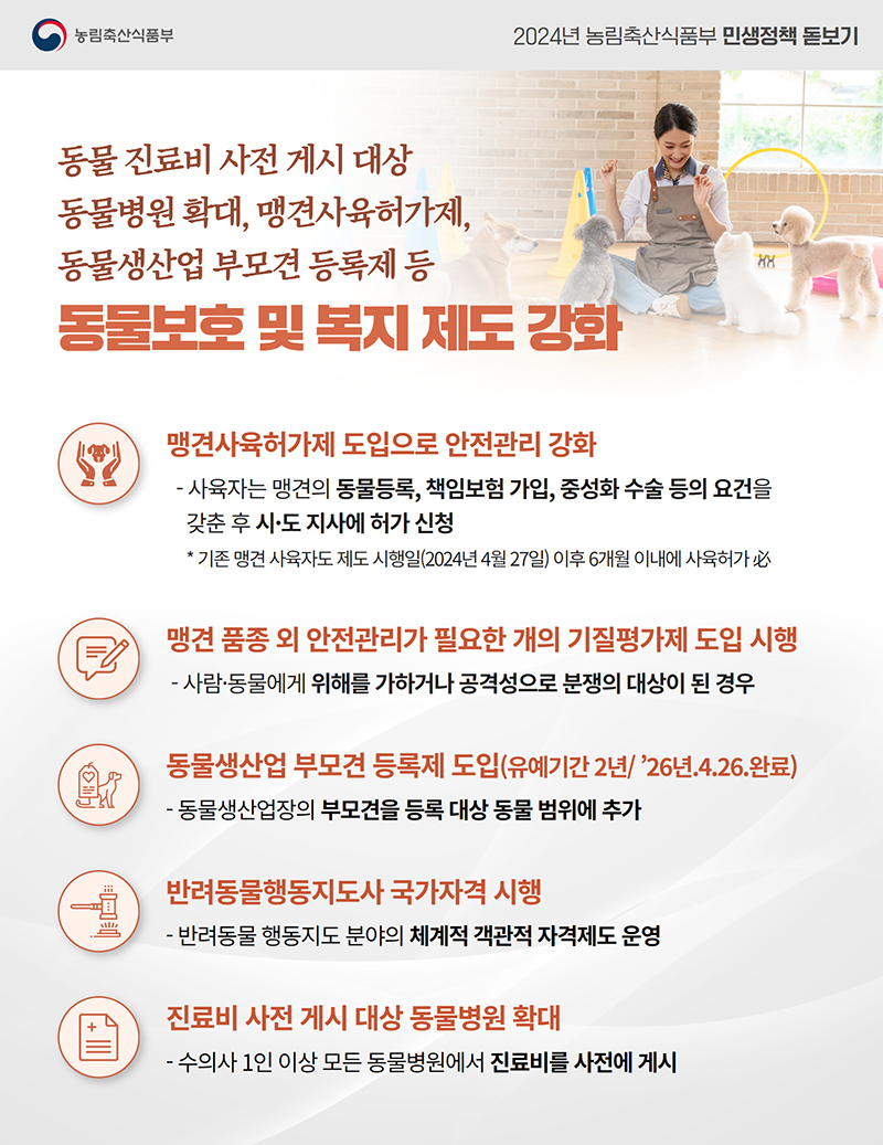 또 동물생산업 부모견 등록제가 도입되는 한편, 모든 동물병원은 동물 진료비를 사전에 게시해야 한다.