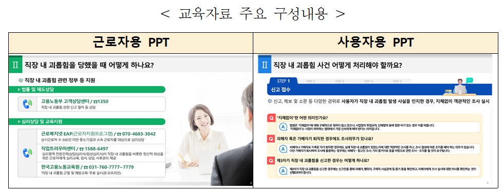 먼저, 사업장 자체 직장 내 괴롭힘 예방 교육에 활용할 수 있도록 근로자에게 꼭 필요한 정보를 담은 「근로자용 교육자료」와 사용자가 꼭 알아야 하는 「사용자용 교육자료」를 PPT와 동영상으로 각각 제작·보급한다. 동 교육자료는 고용부·교육원 홈페이지에서 다운받을 수 있다.