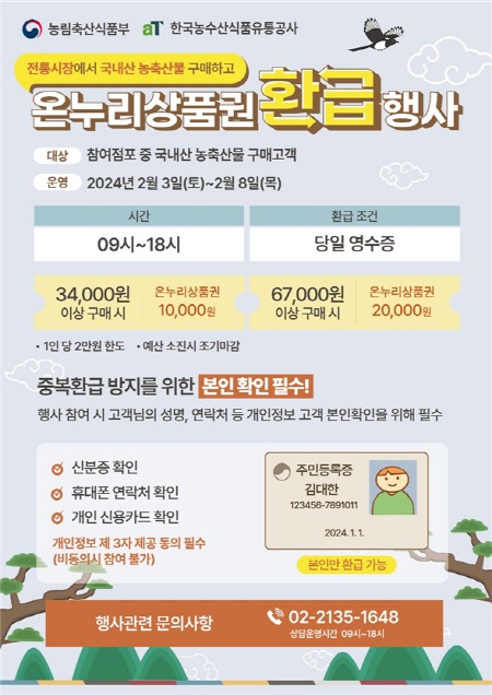 소비자들은 행사 추진 시장에서 국산 신선 농축산물이나 수산물을 구매하고 영수증과 신분증을 지참해 시장 내 환급 부스에 가면 본인확인 뒤 온누리상품권을 환급받을 수 있다.