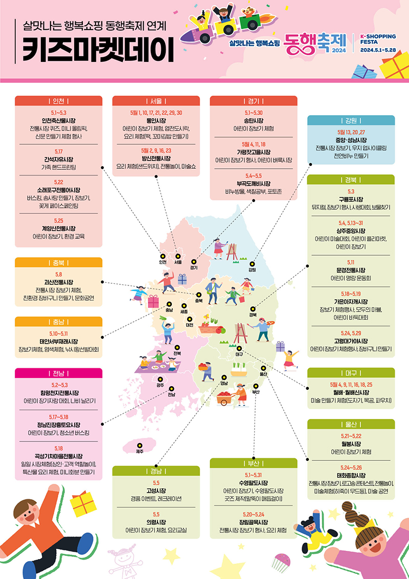 5월 중 관광열차를 타고 팔도장터에서 물건도 구매하고 지역축제를 함께 구경할 수 있도록 10곳에 팔도장터관광열차가 운행된다. 문화관광형 전통시장 30여 곳에서는 어린이들이 만들기와 장보기 체험을 할 수 있는 키즈마켓데이를 열어 자녀와 함께 즐길 수 있다.