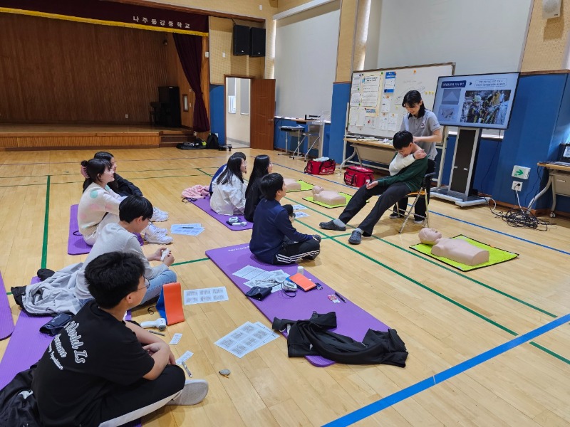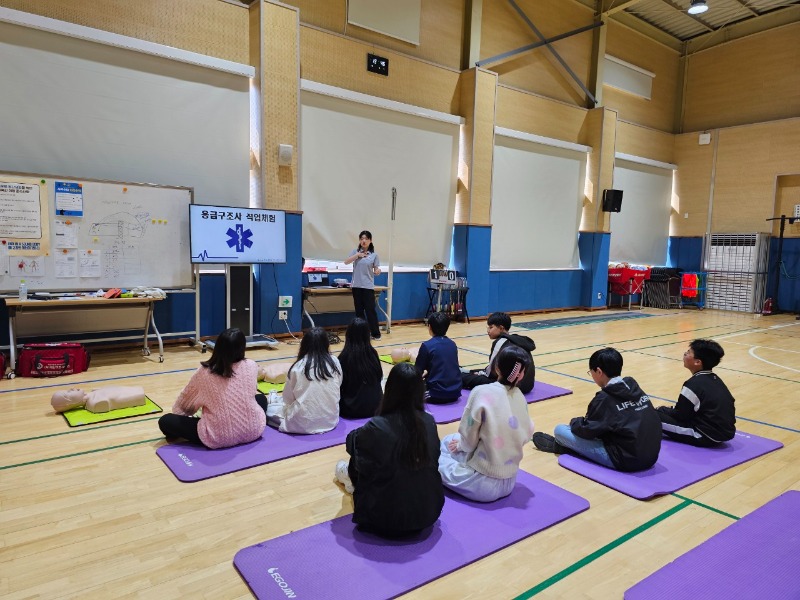 농촌지역 청소년을 대상으로 동강중학교 9명 전학년에 "찾아가는 응급구조사 (EMT) 진로직업체험"을 실시하였습니다.