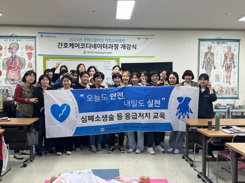 광주광산여성새로일하기센터 주관 간호케어코디네이터교육과정 참여 대상자들은 비엘에스(BLS) 8시간 교육과정 양성과정 수료 및 검정 평가 실시하여 "재난구호사협회 비엘에스(BLS)자격증"을 전원 취득하였고 생활안전서포터즈 역할을 할 수 있을거라 사료됩니다.