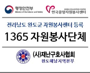 (사)재난구호사협회 완도해남지역본부는 전라남도 완도군 자원봉사센터 "1365 자원봉사수요처 및 단체"로 등록 되었다.