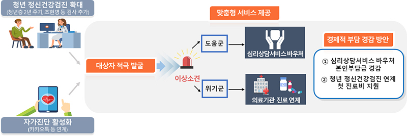 먼저 청년 정신건강검진은 2년마다(기존 10년) 실시해 우울증 검진에 조기정신증 검진을 추가하고, 검진결과 필요한 경우 첫 진료비를 지원한다.