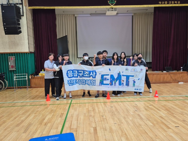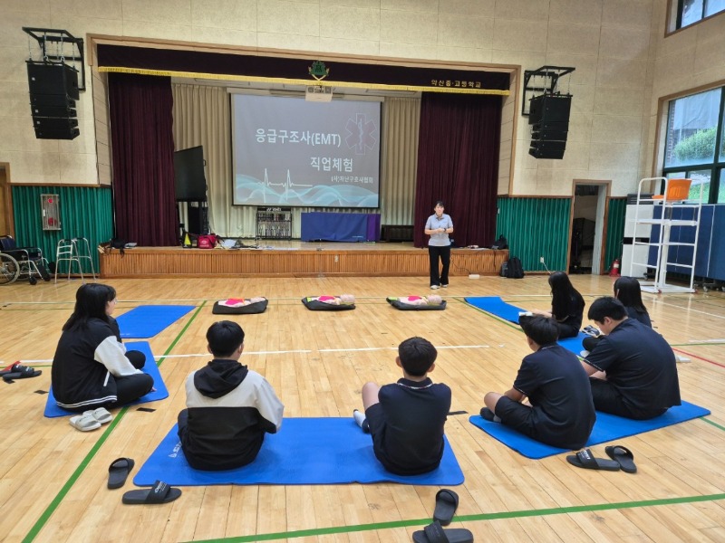 (사)재난구호사협회. 약산중학교 (10명)을 대상으로 꿈길 교육부 연계 프로그램인 진로체험버스 "찾아가는 응급구조사(EMT) 및 사회복지사 직업체험"을 학교 강당에서 실시하였습니다.