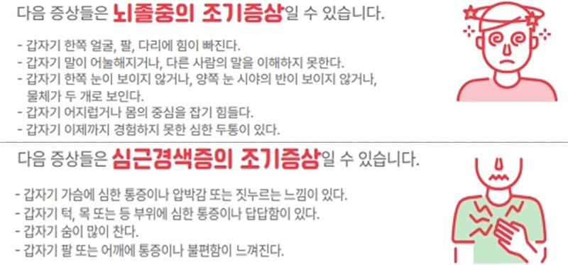 특히 뇌졸중과 심근경색증의 증상은 갑자기 나타나는 것이 특징인만큼 일상생활 때 한쪽 팔다리 마비, 갑작스러운 언어 및 시각장애, 어지럼증, 심한 두통 등이 나타날 때 뇌졸중을 의심해야 한다.