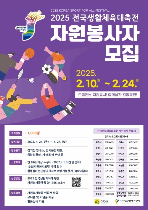 전라남도자원봉사센터는 오는 4월 24일부터 27일까지 개최되는 ‘2025 전국생활체육대축전’의 성공 개최를 위해 약 1천여 자원봉사자를 모집한다고 밝혔다.